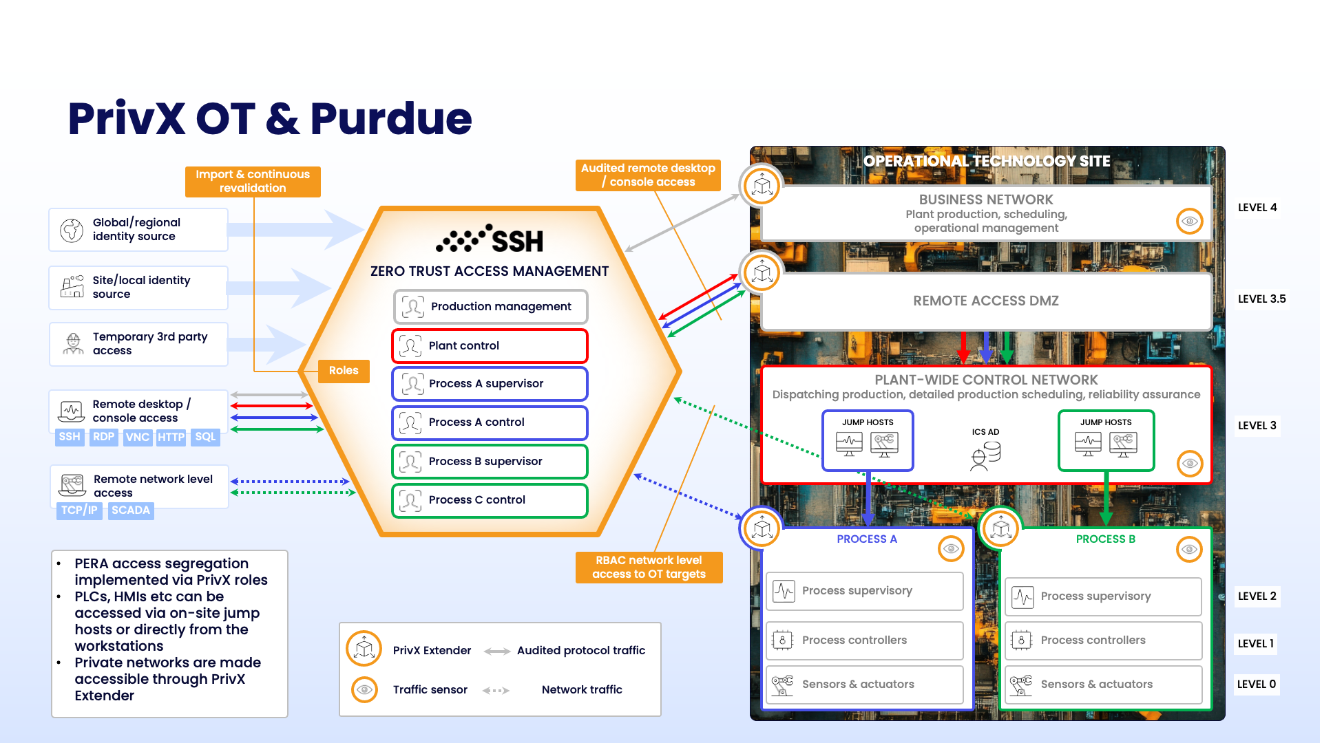 - PrivX OT hosts the site’s required access topography as a role structure. Examples: