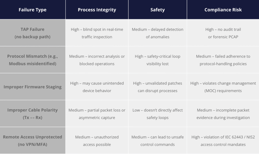 OT networks prioritize reliability, safety, and regulatory compliance. Below is a simple risk matrix showing how specific monitoring failures can impact critical dimensions in an industrial environment: